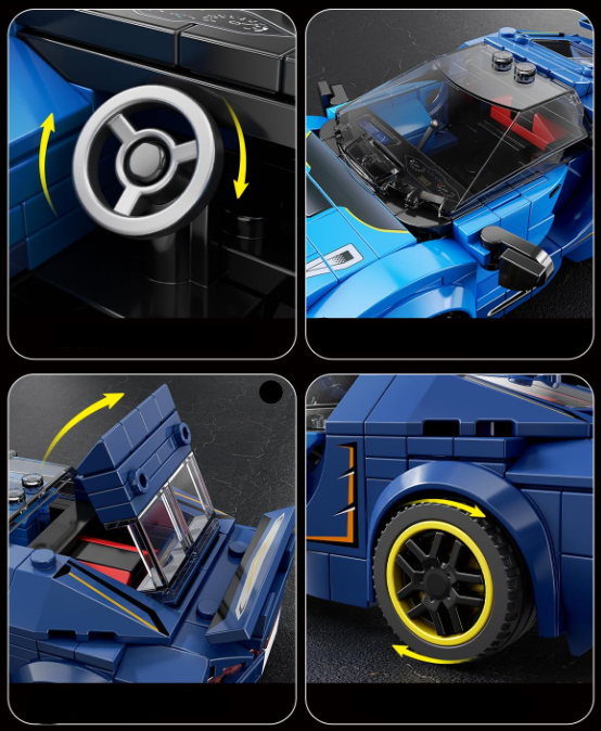 Elementy do zbudowania auta z realistycznymi detalami i ruchomymi kołami