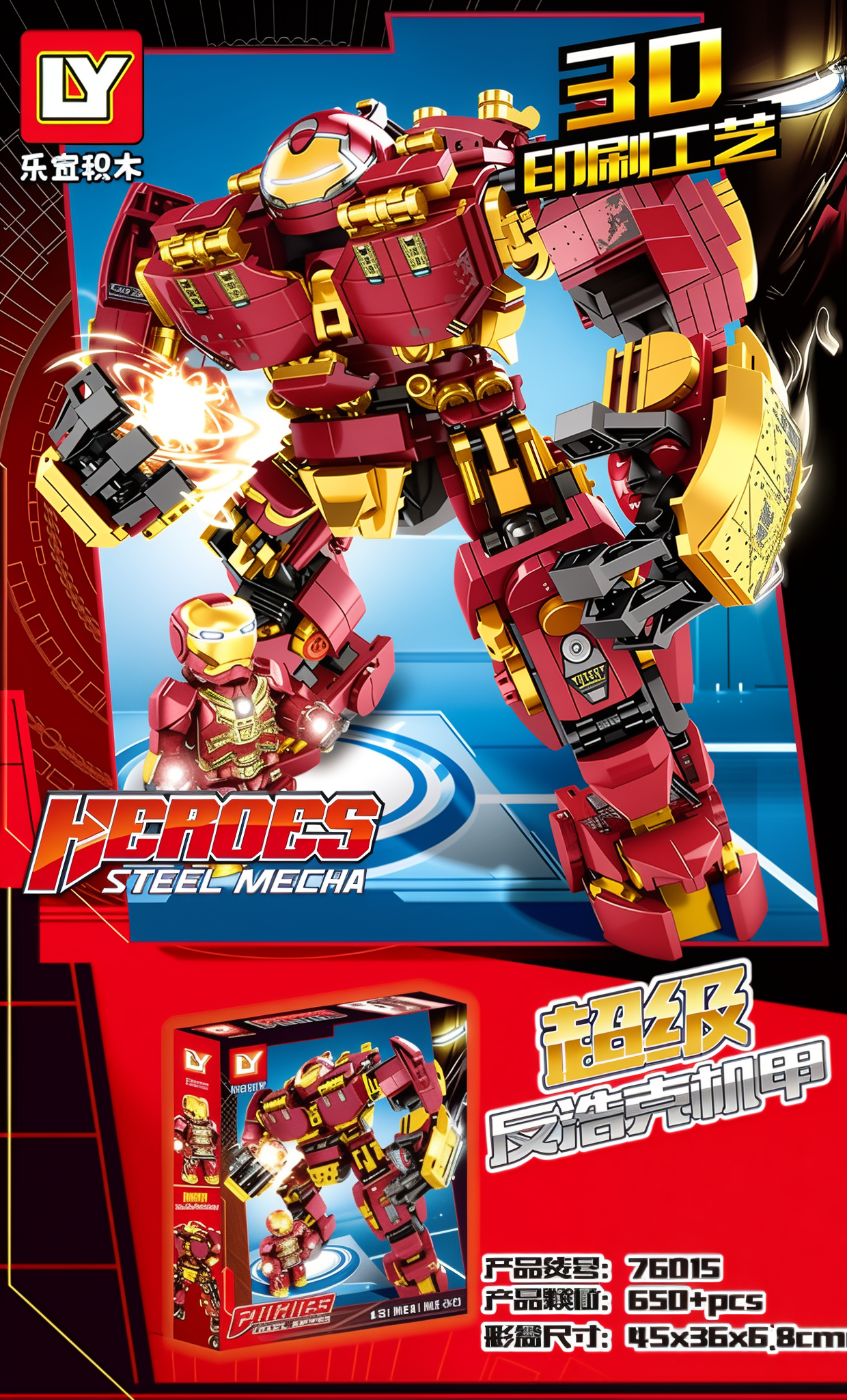 Po złożeniu, duży robot osiąga wysokość 18,5 cm i szerokość 18,3 cm. Konstrukcja posiada ruchome kończyny i realistyczne detale odwzorowujące pancerz Iron Mana, w tym złote i czerwone elementy z efektem zużycia bojowego.