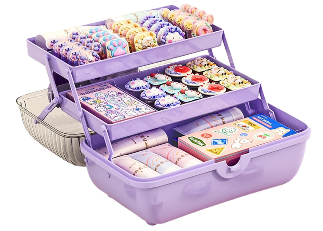 - Wnętrze: Organizer po otwarciu rozkłada się w kaskadę – posiada dwie górne tacki oraz głębszy pojemnik na dole, dzięki czemu idealnie pomieści zarówno drobne, jak i większe przedmioty.