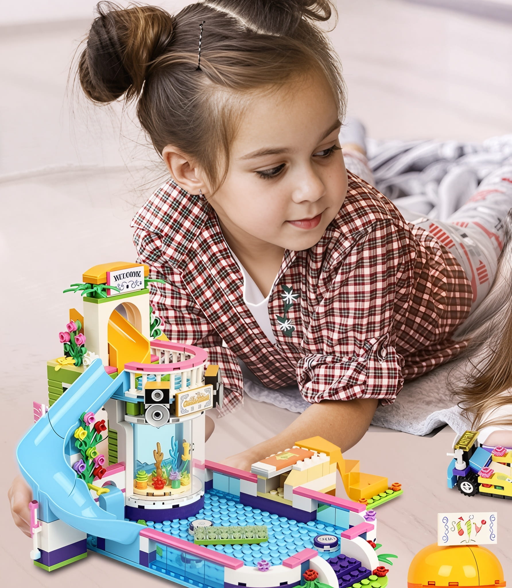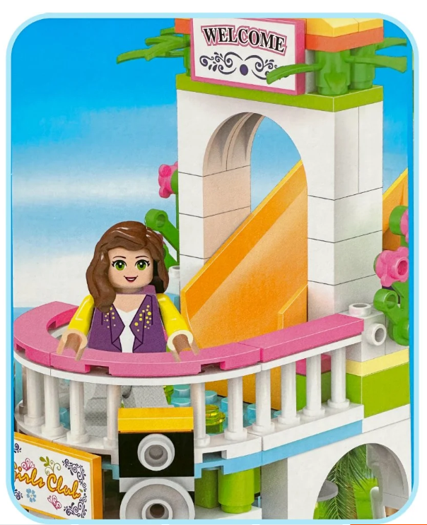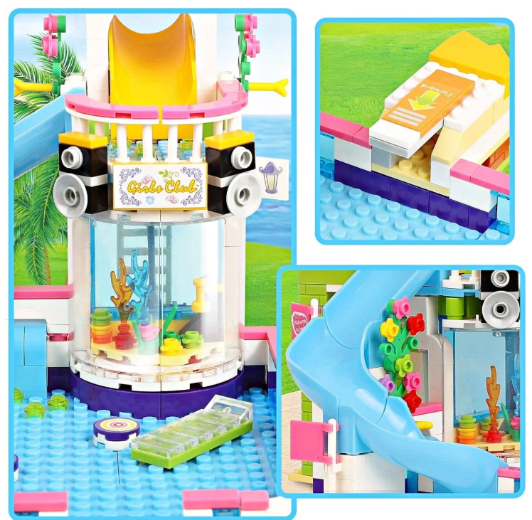 Klocki konstrukcyjne dla dziewczynki BASEN ze zjeżdżalnią, jacuzzi, grill, autka, ludziki – ZESTAW PREZENT