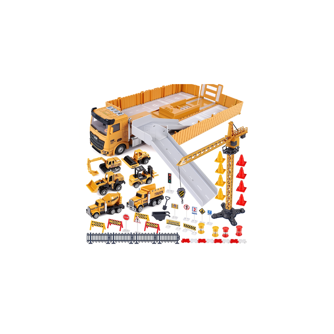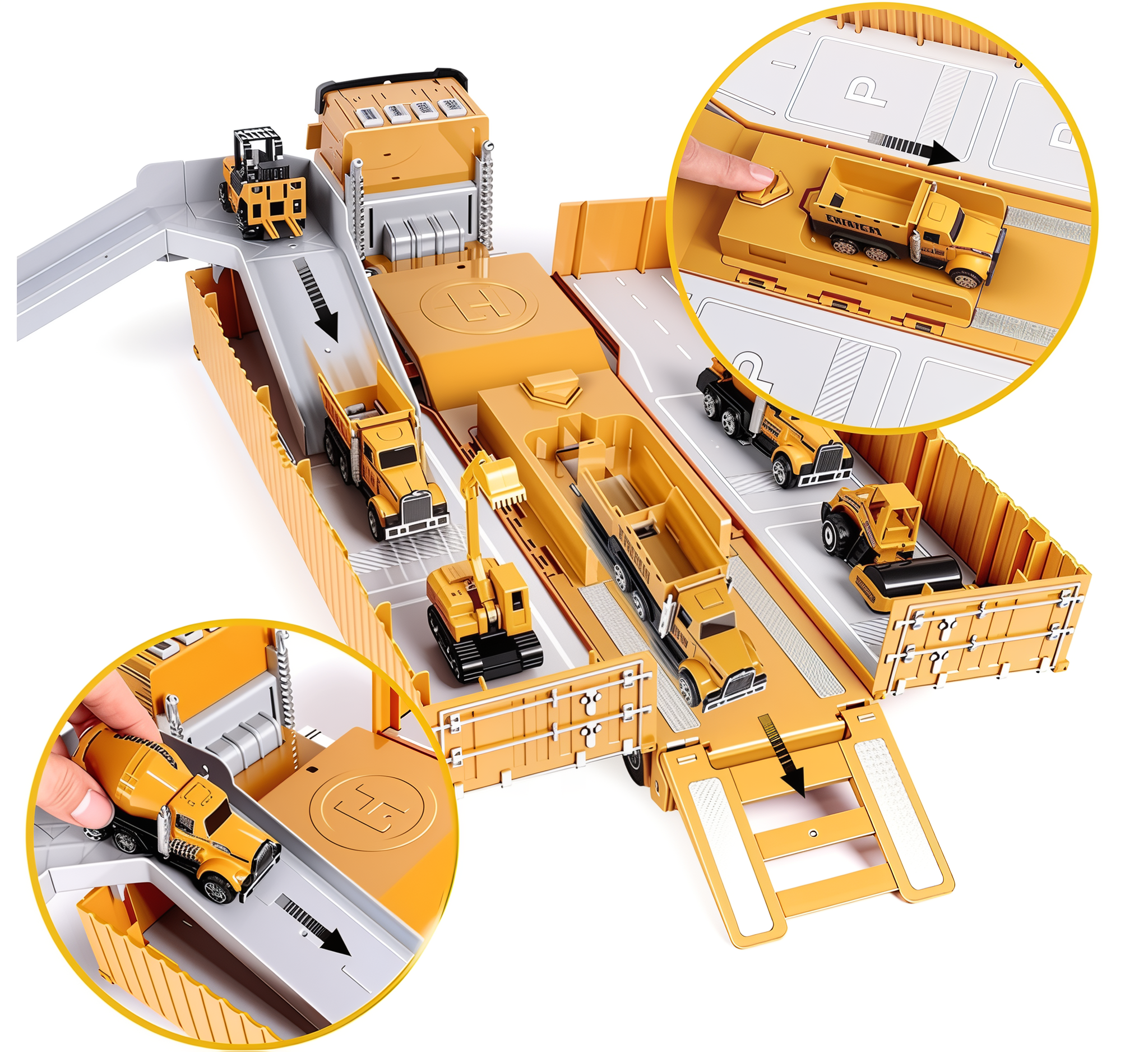 ✅ Ciężarówka z lawetą – Duży TIR transportuje pojazdy budowlane na miejsce budowy. Dzięki realistycznemu designowi i ruchomym elementom dziecko poczuje się jak na prawdziwym placu budowy.