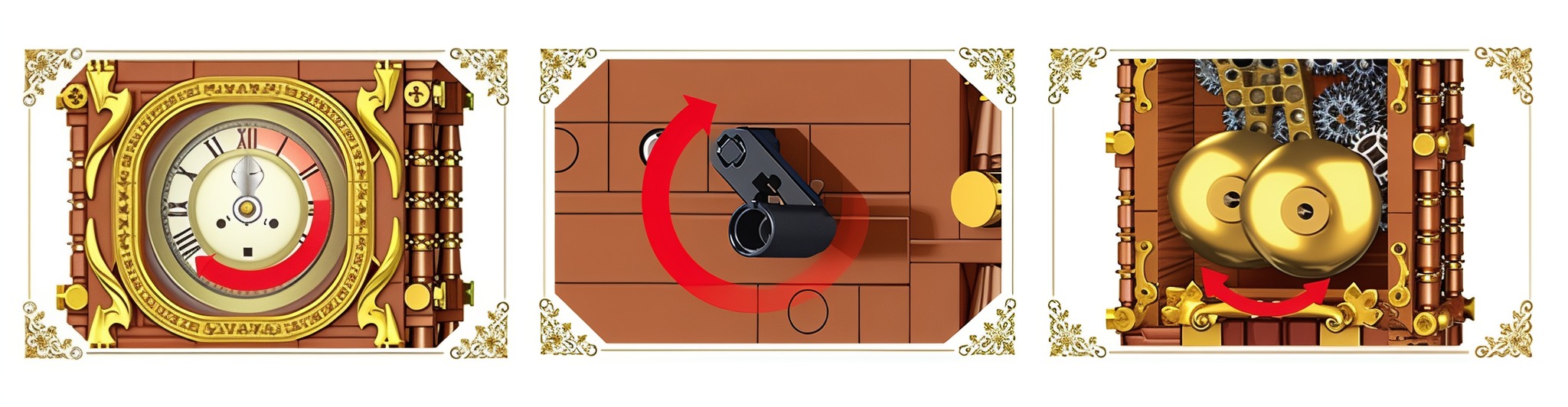 Zestaw konstrukcyjny inspirowany zabytkowymi zegarami z mechanizmem wahadłowym, który zachwyca detalami, złotymi wykończeniami i bogatą ornamentyką.